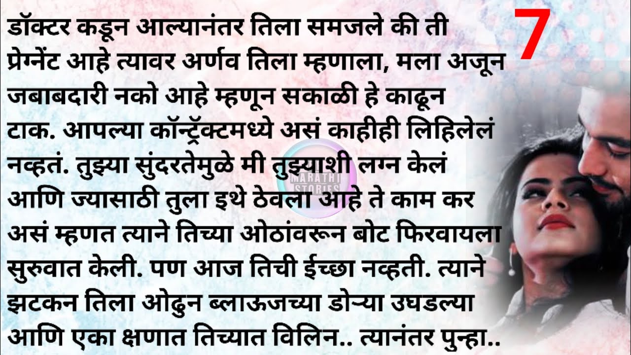 डॉक्टर कडून आल्यानंतर तिला समजले की ती प्रेग्नेंट आहे त्यावर अर्णव तिला म्हणाला, मला अजून जबाबदारी नको आहे म्हणून सकाळी हे काढून टाक. आपल्या कॉन्ट्रॅक्टमध्ये असं काहीही लिहिलेलं नव्हतं. तुझ्या सुंदरतेमुळे मी तुझ्याशी लग्न केलं आणि ज्यासाठी तुला इथे ठेवला आहे ते काम कर असं म्हणत त्याने तिच्या ओठांवरून बोट फिरवायला सुरुवात केली. पण आज तिची ईच्छा नव्हती. त्याने झटकन तिला ओढुन ब्लाऊजच्या डोऱ्या उघडल्या आणि एका क्षणात तिच्यात विलिन.... त्यानंतर पुन्हा..