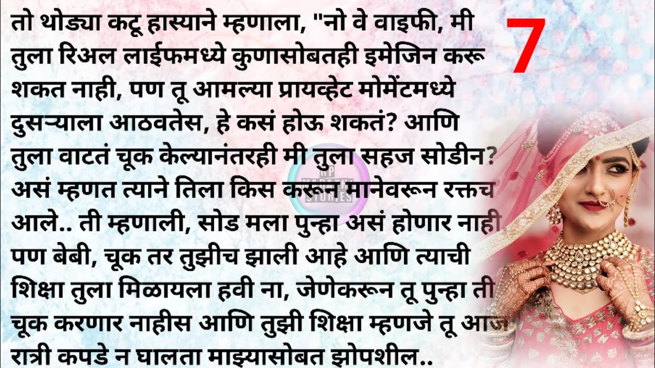 तो थोड्या कटू हास्याने म्हणाला, "नो वे वाइफी, मी तुला रिअल लाईफमध्ये कुणासोबतही इमेजिन करू शकत नाही, पण तू आमल्या प्रायव्हेट मोमेंटमध्ये दुसऱ्याला आठवतेस, हे कसं होऊ शकतं? आणि तुला वाटतं चूक केल्यानंतरही मी तुला सहज सोडीन? असं म्हणत त्याने तिला किस करून मानेवरून रक्तच आले.. ती म्हणाली, सोड मला पुन्हा असं होणार नाही. पण बेबी, चूक तर तुझीच झाली आहे आणि त्याची शिक्षा तुला मिळायला हवी ना, जेणेकरून तू पुन्हा ती चूक करणार नाहीस आणि तुझी शिक्षा म्हणजे तू आज रात्री कपडे न घालता माझ्यासोबत झोप..